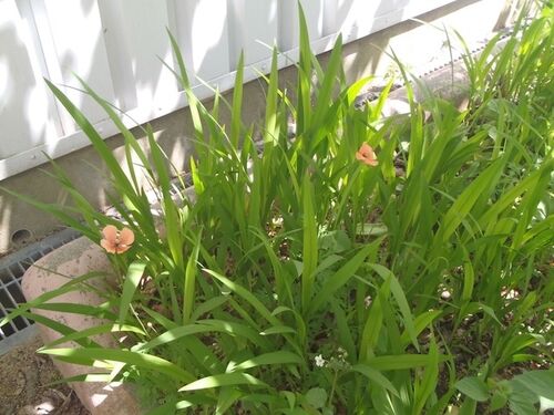 ひなげしが至るところで咲いている。 蕾をつけたアヤメを見つけたと思ったら、 翌朝、開いていた。 二つ目も・・。 だいぶ離れて、こんな所にも。ここは下にベゴニアが咲いているブロックの中。 シラー・カンパニュラータ。 レンテンローズの葉の茂みの中に…