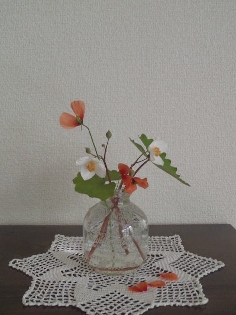 ポピーらしいオレンジの花と、白い花を摘んできた。