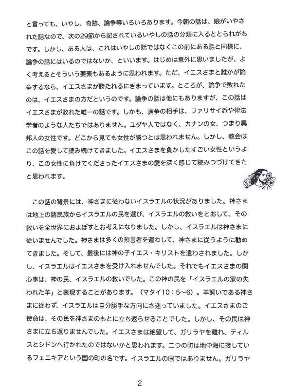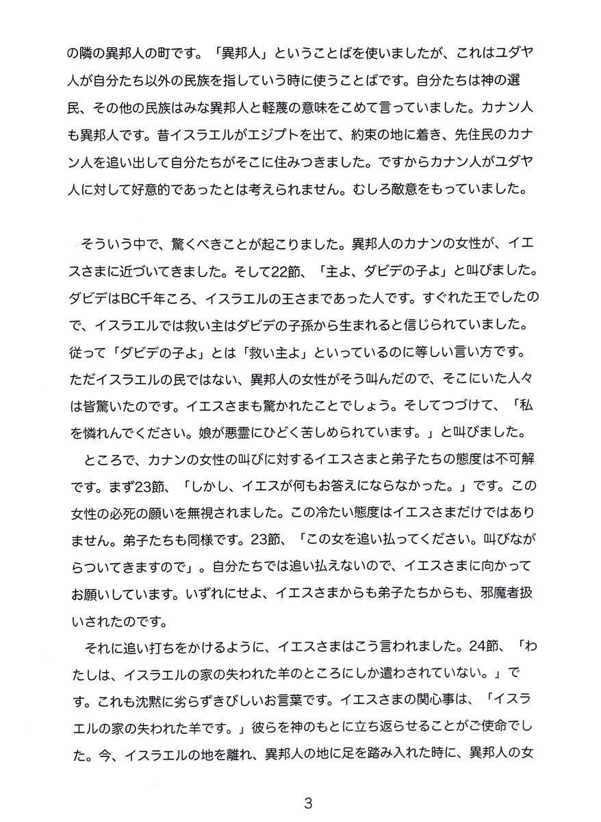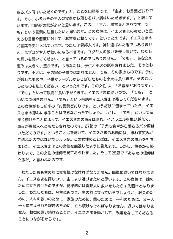 2022-04-30 『聴く』3、4月号 説教 『聴く』3、4月号は、他教派の引退教師によるお説教を掲載させて頂きました。 「キリストの前に近づいて」(マタイによる福音書15:21〜28) カナンの女性は決して言い淀んではいませんが、○○先生の「『子犬も食卓から落ちるパン屑はいただくのです』ということばを聴いて、イエスさまのお顔には、思わず笑みがこぼれたのではないでしょうか」というお説教をお聞きして、この短歌を思い浮かべました。